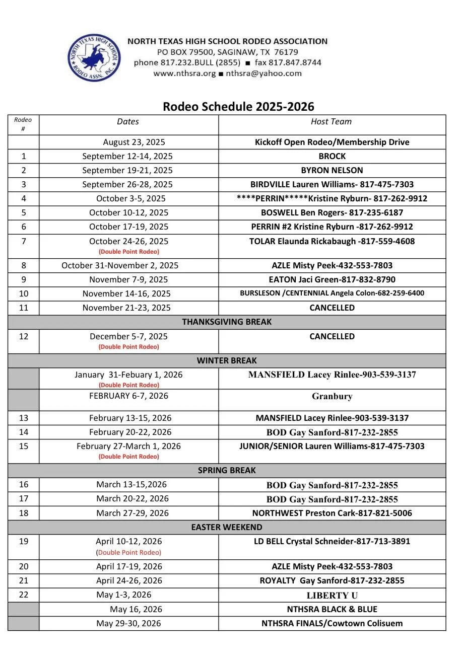2025-2026 North Texas High School Rodeo Association Schedule